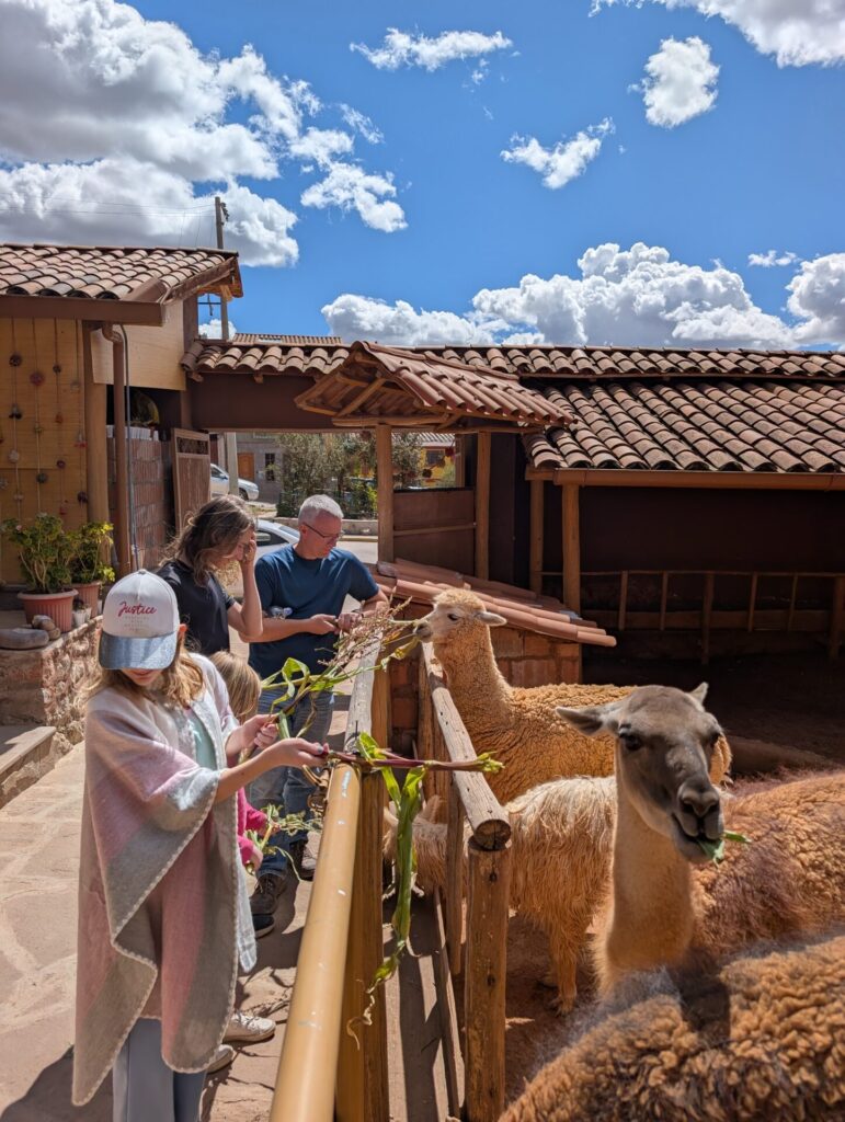 Despite the miscommunication with our reservation, the kindness of the locals turned our exhaustion into gratitude. Before check-in, we wandered into the small town of Chinchero where we enjoyed historical structures and fed llamas and alpacas. The softness of their fur was what I imagine floating on a cloud would be like. We were then shown how local artisans transform alpaca wool into vibrant threads using natural dyes—reds from cochineal insects, yellows from marigolds, reds from cacti, and deep blues from other native plants. We quickly learned that Sacred Valley isn’t just a place of ruins, but of traditions still alive today.