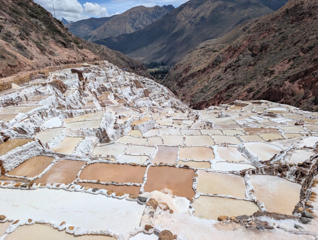 The Maras Salt Pans are another incredible sight, dating back to the Inca era. There are over 6,000 individual ponds being fed by a natural underground saltwater spring. The water flows into the pools, evaporates in the sun, and leaves behind vibrant white salt. The color of each pool shows which ones are ready for harvest. The whole process takes about a month, with each pond producing up to 450 pounds of salt. Local families still hand-harvest the salt today. As we neared closer, the air was thick with heat, and we could almost taste the salt rising from the ponds.